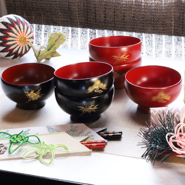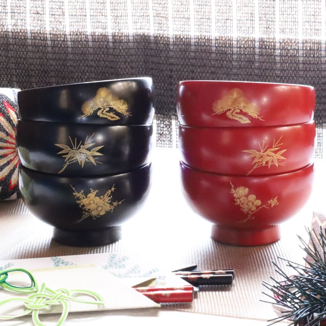今回は松・竹・梅の沈金を施したお椀とお箸のお得なセットとなっています。